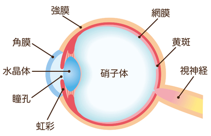飛蚊症の原因としては、目玉の中にある硝子体(しょうしたい。図表参照)の内部に何らかの物質が浮遊していて、それが見えていることです。そのため「目を閉じると見えない」です。目を閉じても見えるということは飛蚊症ではありません。また、浮遊しているので「目を開けている間は絶えず見えている」という人もいますし、「見えたり見えなかったりする」という人もいます。