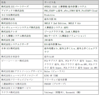 <給与デジタルマネー払いゲートウェイサービスとの仕様合意済み人事給与システム事業者一覧>(五十音順)2022年10月20時点