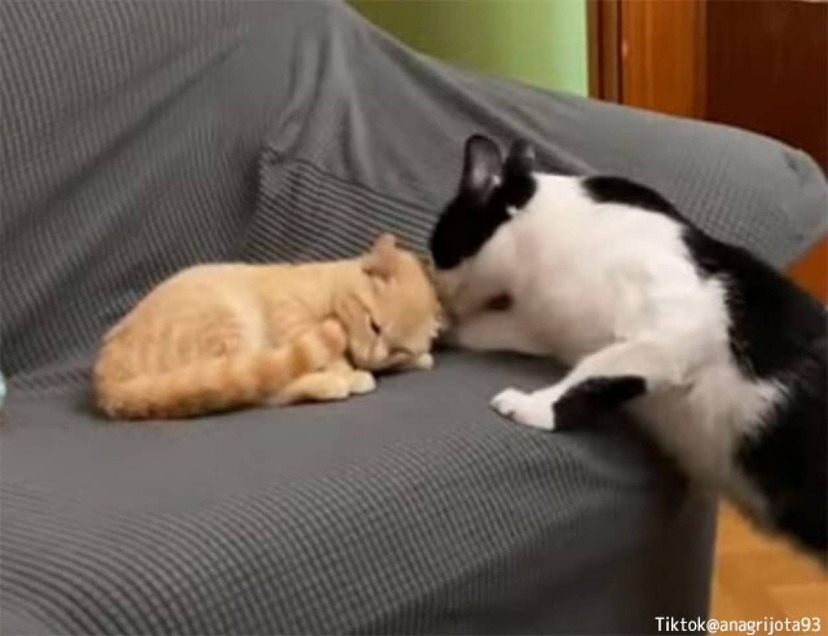 子猫も先住猫に信頼を寄せており、今ではつねに一緒に遊んだり、くつろいだりしている。