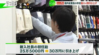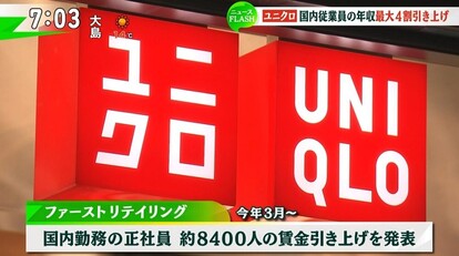 ユニクロを展開するファーストリテイリングは、3月から国内で勤務する正社員約8,400人の賃金を引き上げると発表。その上げ幅は数%から最大で40%。また、新入社員の初任給を現行の25万5,000円から30万円に。入社後1、2年で就任する新人店長は29万円から39万円に引き上げます。