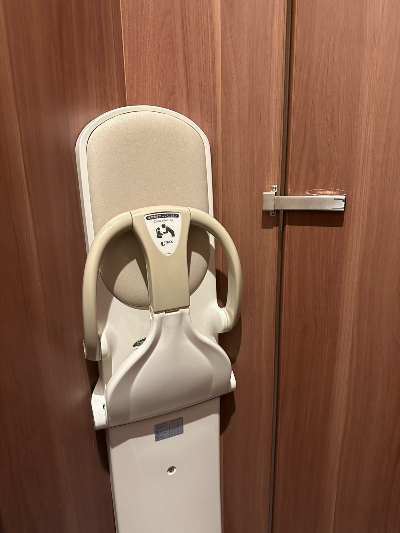 一見すると子ども連れの人にとってありがたい設備。しかし、ベビーチェアとドアのカギが近すぎて、座った子どもにあけられてしまう可能性があるという致命的な欠陥が……。