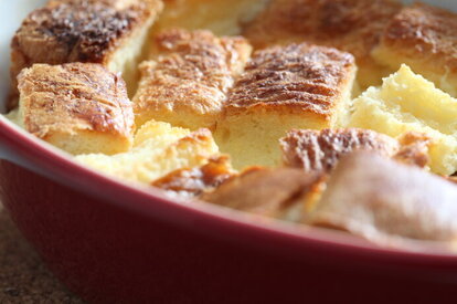 英語だとブレッドプディング(Bread Pudding)とも言われるパンを使ったお菓子。使うパンに特に決まりはなく、残って少し硬くなってしまったパンを美味しく食べる方法として作られることが多いようです。パンの柔らかな食感と、耳や皮のパリッとした食感、そのコントラストを楽しめるメニュー。今回は食パンを使いましたが、フランスパンなどの皮が硬めのパンで作るのもおすすめ。その際は、厚切りにして皮をしっかり焼いてくださいね。