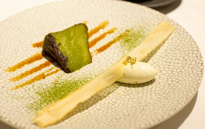 一方、羽生九段は「自家製あんこと京都一保堂の抹茶を使ったバスクチーズケーキ 立川産軟白うどのチップを添えて」と東京紅茶(温)を注文。こんがりとした焼き目が香ばしいバスクチーズケーキを抹茶とあんこで和テイストに仕立てた一皿で、立川の名産・うどのチップが目を引いている。
