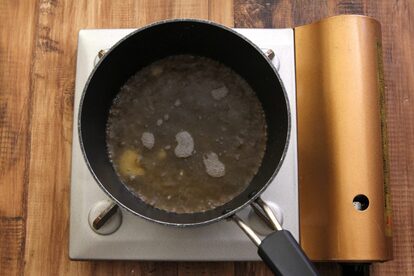 水350ml、鶏ガラ大さじ1、3倍濃縮麺つゆ大さじ1/2、おろしにんにく小1/2を強火で熱し、煮立てます。