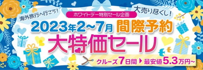「海外旅行へ行こう!ホワイトデー特別セール企画【2023年2~7月クルーズ間際予約大特価セール】」と銘打って、2023年2月~7月出発の間際出発の商品をお得な料金にてご提供いたします。