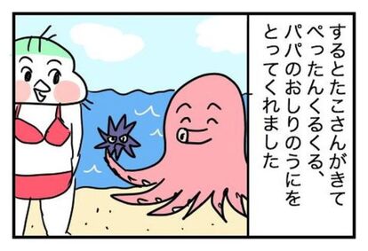 子供らしくかわいいお話…と思いきや、パパの扱いが少し荒々しい! ウニのトゲでおしりを刺され、最終的に海に沈められてしまう姿には、思わず吹き出してしまいますね。