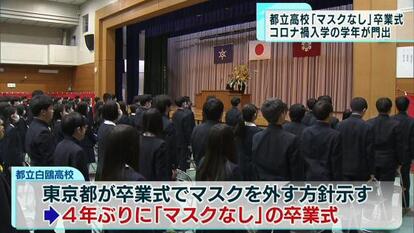 約230人の3年生が門出を迎えた台東区にある都立白鴎高校の卒業式。東京都が都立学校の卒業式でマスクを外す方針を示したことを受け、この学校でも約4年ぶりに「マスクなし」での卒業式となりました。ただ、着用の判断は個人に委ねられているため、ほとんどの卒業生がマスクを着用して出席しました。また、校歌や国歌の斉唱は「マスクなし」のため歌唱入りの音源が流されましました。