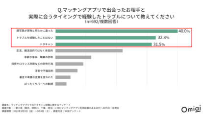 株式会社エニトグループの下で、恋愛結婚をかなえるマッチングアプリ『Omiai』を手掛ける株式会社Omiai(本社:東京都港区、代表取締役CEO:清水宏昭、以下、当社)は、20代~40代の一般男女のうち、マッチングアプリの利用経験がある692名を対象に、「マッチングアプリでのトラブル経験」に関してアンケートを実施、昨今マッチングアプリでの出会いが一般化しつつあるなか、気を付けるべきトラブルを調査しました。