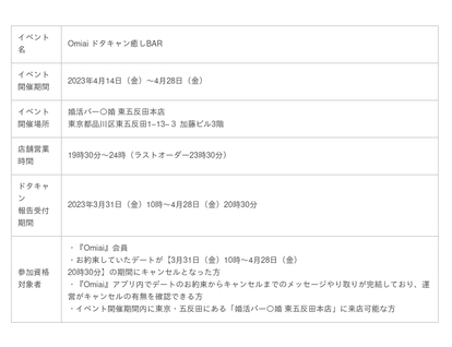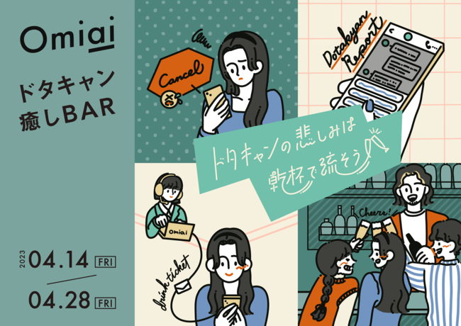 最大限注意を払っていても、ドタキャンされてしまうこともあります。万が一ドタキャンにあってしまった『Omiai』会員の悲しい気持ちを軽減するため、この度『Omiai』は、独身男女が出会いを求めて集う『婚活バー○婚』とコラボレーションし、『Omiai ドタキャン癒しBAR』を4月14日(金)~28日(金)の期間限定で開催する運びとなりました。ドタキャンされてしまった会員に、チャージ料金とドリンク1杯を無料で提供します。『婚活バー○婚』にいらっしゃるお客様やスタッフさんと乾杯し、ドタキャンされた悲しみを癒していただきたいです。