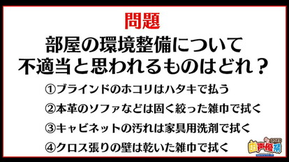 ここで出題されたのは、“部屋の環境整備について不適当と思われるものはどれ?”という4択問題で、選択肢は以下の通りでした。