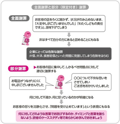 適切な謝罪とは、「お待たせして申し訳ございません」「ご案内が行き届かずご迷惑をおかけしました」というように、お客様が不満に思っていることにポイントを絞って「部分(的に)謝罪」(限定付き謝罪ともいう)することです。