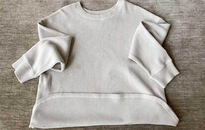 トップスはすその部分を少し折り返します。両そでは内側に折りましょう。