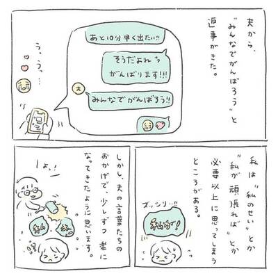 夫から届いた「みんなでがんばろう!」という言葉にハッとし、気持ちが楽になったそうです。