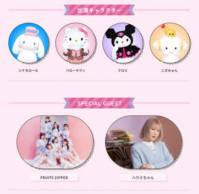 サンリオキャラクターたちが歌とダンスで盛り上げるスペシャルステージでは、シナモロールが6月に発表予定の新曲を初パフォーマンスするほか、スペシャルゲストとして”わたかわ”で人気の7人組アイドルグループFRUITS ZIPPERと、ポップスピアニストのハラミちゃんの出演が決定しました。