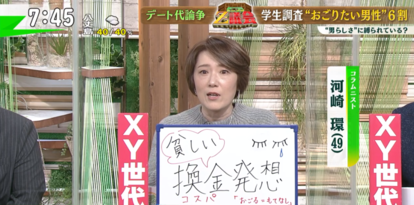 XY世代のコラムニスト・河崎環さんは「こういう考え方自体が“貧しい”」と嘆息。そもそも“おごる”という行為は“もてなしの気持ち”であるとし「まず男女は関係ない」と河崎さん。