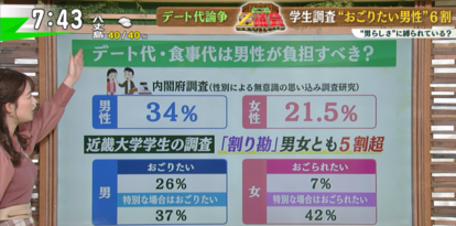 デート代・食事代に関する内閣府の調査では、男性が負担すべきという回答は、男性が34%で、女性は21.5%。また、近畿大学の学生が学生に向けて行った調査では、「割り勘」という回答が男女とも5割を超え、一方で理想は「おごりたい」と思っている男性が26%。「おごられたい」と思う女性が7%。そして、「特別な場合はおごりたい」という男性は37%。「特別な場合はおごられたい」という女性は42%でした。