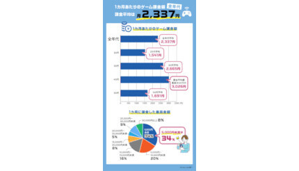 予備調査において、「オンラインゲームに課金することがある」と答えた人のうち1000人に、オンラインゲームへの課金状況を尋ねた質問では、オンラインゲームの課金額は月平均で2337円となり、40代(3026円)がもっとも高かった。