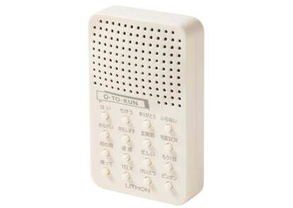 ボタンを押すと男性の声で応答してくれる音声ボタン。宅配便の受け取りやセールスへの対応時などにインターホン越しに使用することで、玄関先で対面することへのストレスや不安を軽減してくれる。全16種類の音声パターンを収録しており、様々なシチュエーションに対応可能。