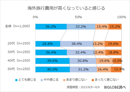 全国の20代から50代の男女1,000人に「旅行費用について、高くなっていると感じるか」を質問すると、国内旅行は「やや感じる」(47.3%)と回答した割合が最も多く「とても感じる」(29.3%)をあわせ8割近くにのぼり、年代別では50代が最も感じている割合が多かった。
