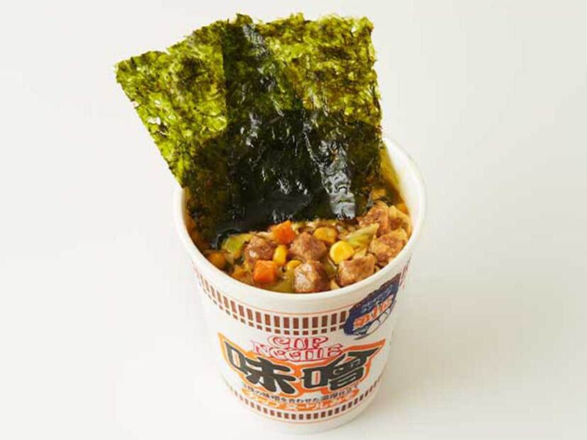 『カップヌードル 味噌』を通常どおりに作ったら、ごま油と韓国のりを適量加えるだけで完成です。