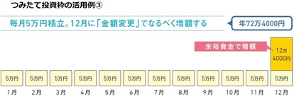 フジコ先生:あとは、図表3のように、1年間の最後に余裕資金を増額するのもアリです。普段はコツコツ積み立てていって、1年間の最後に余裕資金を増額すれば、無理なく、無駄なくつみたて投資枠を活用できますよ。