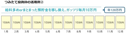 フジコ先生:一方、お給料が高い人や、定期預金にまとまったお金があって、その資金で投資したいという場合には、図表2のように月10万円を積み立てていくのもいいですね。これなら年間120万円をぴったり使い切れます。