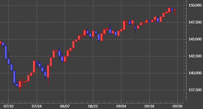 - 9月は「予想以上に強い米景気」の可能性が広がるなか、「米金利上昇=米ドル高・円安」が続き、1ドル150円の大台に肉迫する展開となった。