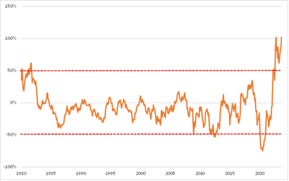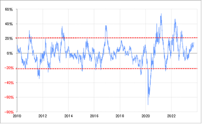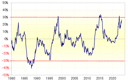 ただし、米10年債利回りの5年MAかい離率はプラス100%まで拡大し、中長期的には異例の「上がり過ぎ」の可能性がありそうです(図表6参照)。