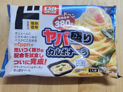 そんなドン・キホーテだが、実は冷凍食品をプライベートブランドで販売していることをご存じだろうか。今回筆者が見つけたのは「情熱価格 ヤバ盛りカルボナーラ」。380gで236円(税込)という安さである。