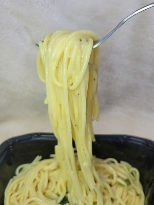 もちもちとした麺がソースと絡まるとぷるぷると口の中で跳ね、「カルボナーラを食べている」という実感がしっかりと沸いてくる。最初は値段の安さから品質に疑いを抱いていたが、「値段の割に悪くない」どころか「この美味しさで他よりもお得に買えるの!?」という衝撃と共に完食。なんと、ソースはトレーに余っていた。