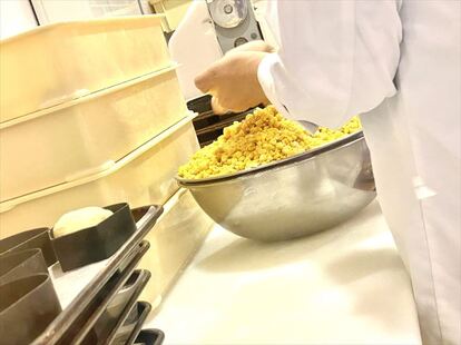 待っている間、店頭ではガラス越しにコーンぱんを作っている様子も見られます。ボウルいっぱいのコーンの山! そしてパン生地にコーンが詰められていきます。見ているだけでめちゃめちゃおいしそうです。早く焼き上がりを食べたい!!