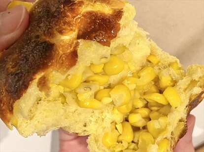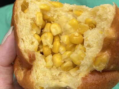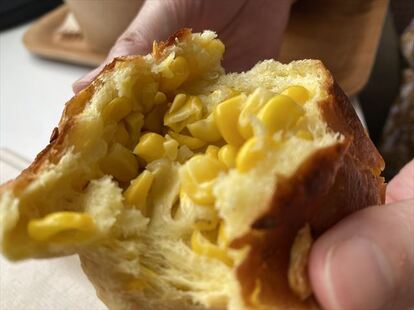 パンを割ってみると、中にはコーンがたっぷり! 思わずかぶりつくと、コーンがポロッとこぼれてしまうほどのボリューム感です。