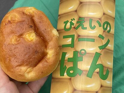 箱には大きく「びえいのコーンぱん」の文字。コーンぱんの表面もおいしそうな色に焼けています。