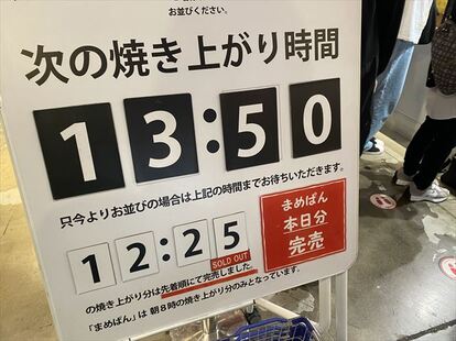 筆者が訪れた時間は平日の12:15ごろ、店頭には行列が見えます。すでに並んでいる人たちで12:25焼き上がり分は完売、次の焼き上がり時間は、1時間半後の13:50とのこと。