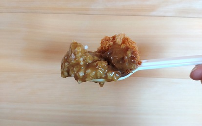 次に、ご飯とカレールウ、カキフライを一緒に口の中に放り込みます。ちなみにカレールウは「ポークソース」、辛さは普通で注文しました。少しスパイシーだけど、どんな具材にも合うCoCo壱番屋のポークソースが牡蠣ともベストマッチ! 牡蠣の味が濃いので、カレーに負けていません。むしろ牡蠣とカレーの相乗効果で、いつものカレーがさらに美味しく感じられます。大きなカキフライが4つもあったのに、あっという間に完食してしまいました。