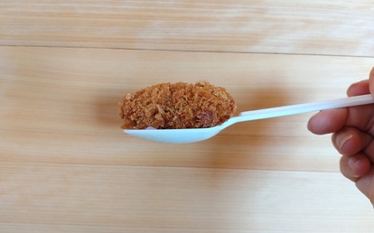 スプーンから零れ落ちそうなほど大きいカキフライを口にしたところ、衣はサクサク! 身はフワフワ! 食感を楽しみながら噛んでいると、中から牡蠣の旨味を含んだ肉汁がジワッと出てきました。ソースも何も付けないでカキフライのみを食べましたが、しっかりと旨味が感じられて美味しいですね。