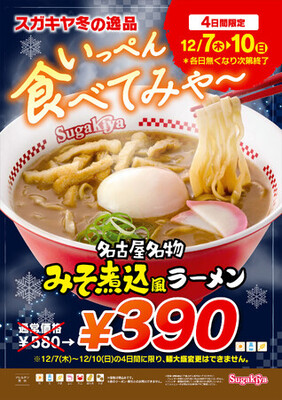 また、日頃よりスガキヤをご愛顧頂いているお客様への感謝イベントとして、12月7日(木)から12月10日(日)までの4日間、スガキヤ冬の逸品「みそ煮込風ラーメン(通常価格580円)」を特別価格390円でご提供いたします。