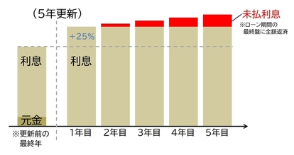 しかし、だからといって、125%を超えた部分が免除されるわけではありません。これも「未払利息」と扱われ、返済期間の最終盤に全額返済しなければなりません。極端なケースだと、返済額の大部分、または全部を利息が占め、かつ、未払利息が発生する可能性が考えられます([図表3]参照)。