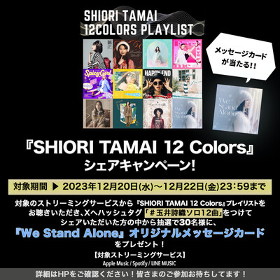 サブスクリプションサービスのシェアキャンペーンの開催が決定した。対象のストリーミングサービスから『SHIORI TAMAI 12 Colors』プレイリストをお聴きいただき、Xへハッシュタグ「#玉井詩織ソロ12曲」をつけてシェアした方の中から抽選で30名様に「We Stand Alone」オリジナルメッセージカード(12cm×12cm)をプレゼント!
