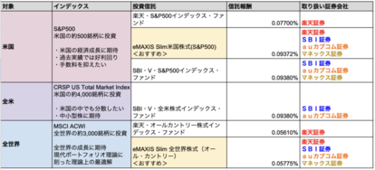 信託報酬が安いインデックスファンドの一覧と購入できる証券会社は[図表1]の通りです。全米を買う人にはSBI証券、楽天市場を使う人には楽天証券がお勧めです。