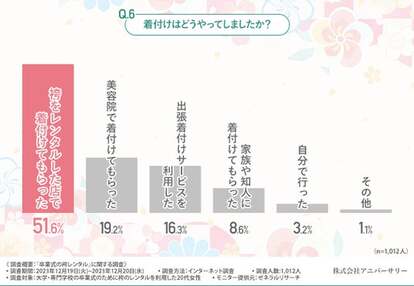 Q6「着付けはどうやってしましたか?」と質問したところ、『袴をレンタルした店で着付けてもらった(51.6%)』と回答した方が最も多く、次いで『美容院で着付けてもらった(19.2%)』『出張着付けサービスを利用した(16.3%)』と続きました。