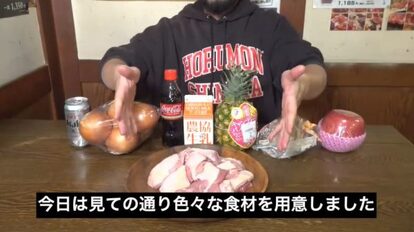 沢山の食材を用意した投稿者のホルモンしま田さん。ビール、玉ねぎ、コーラ、牛乳、パイナップル、舞茸、リンゴといった食材は、これまで牛肉や豚肉がどれくらい柔らかくなるのかの実験で使ってきたそうです。