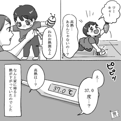正解は「37.0度」でした。 早退して保育園へ行き、急いで娘と帰宅した主人公。 ところが自宅に戻った娘は元気に遊びだしたのです。 「高熱あるんじゃないの?」と不思議に思った主人公が熱をはかると…。 なんと娘の熱は、37度まで下がっていたのでした。 ※こちらは実際に募集したエピソードをもとに記事化しています。 (愛カツ編集部)
